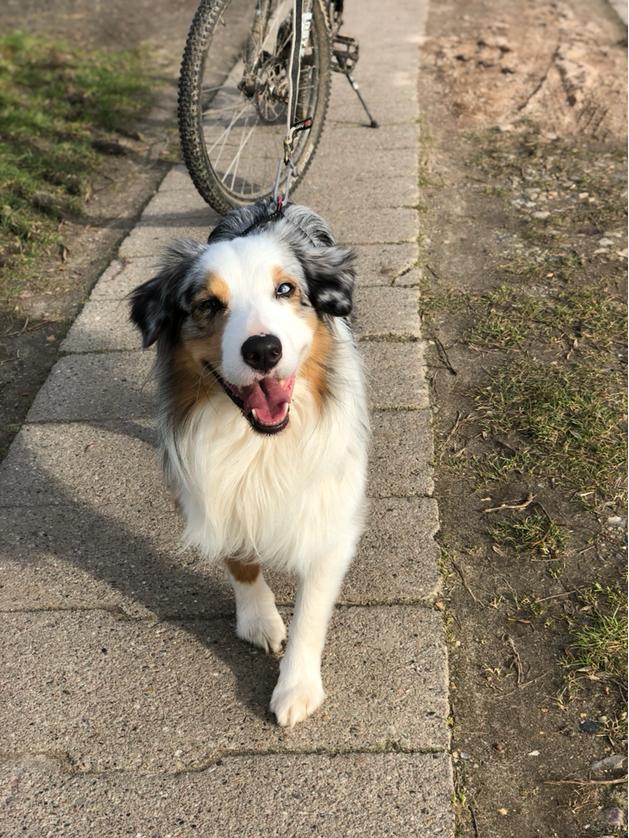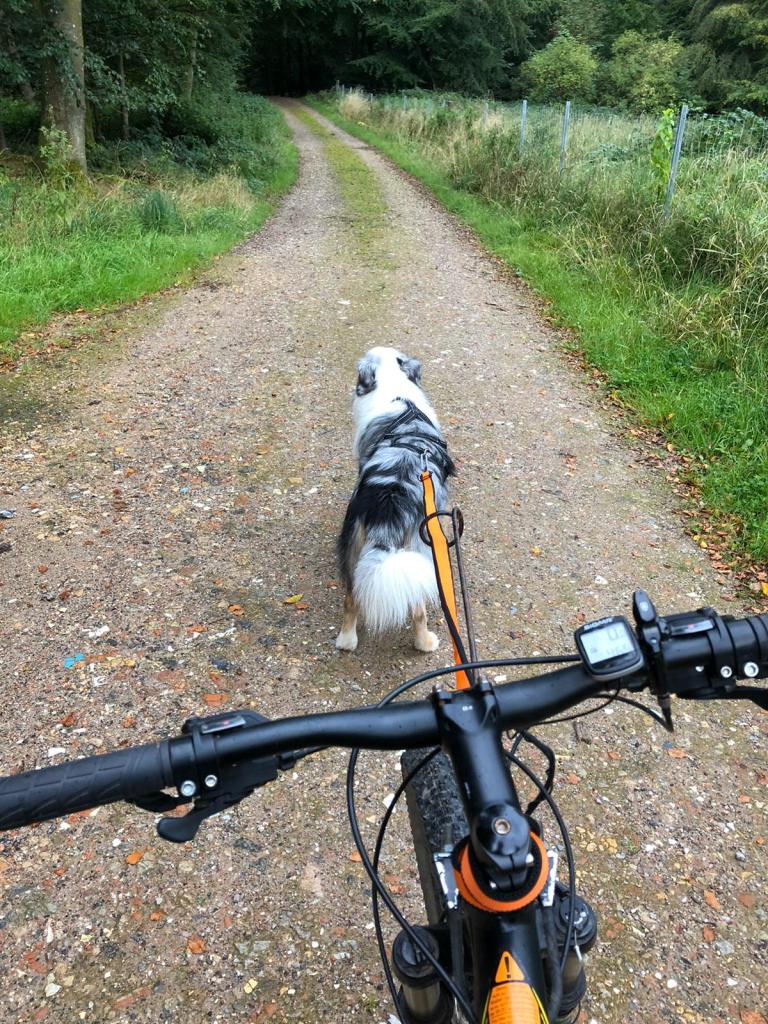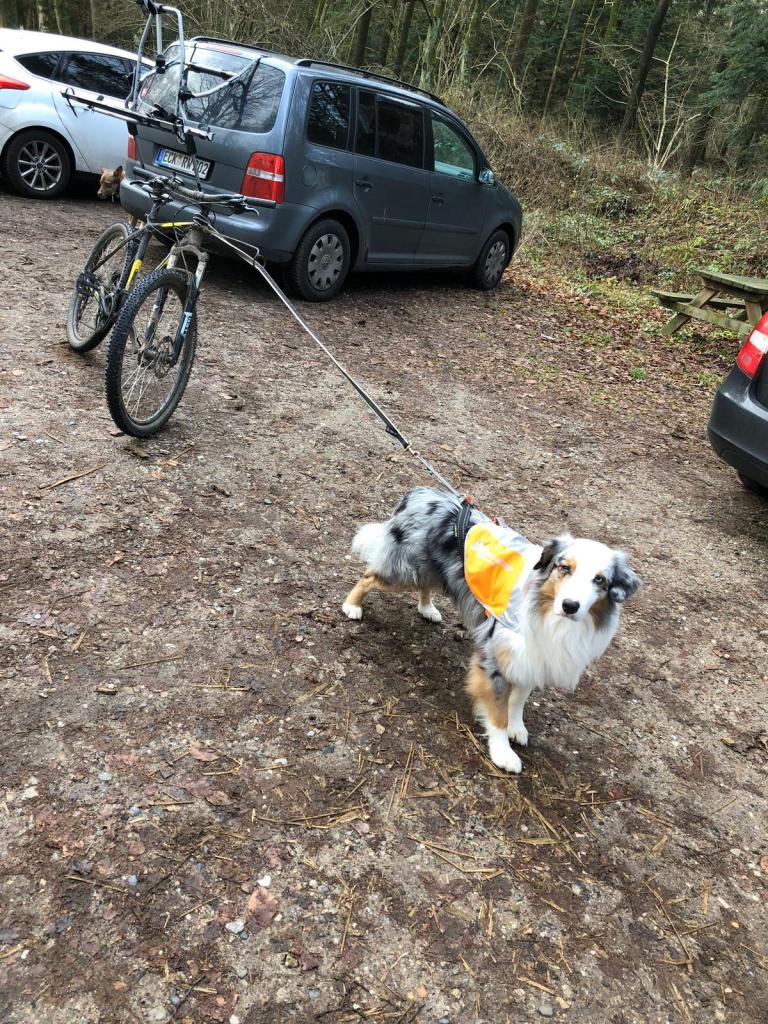 Ein Tipp wäre noch, es gerade am Anfang so zu gestalten, dass du erstmal ein Stück mit Bello im Freilauf fährst und er ein bisschen Energie loswird, bevor du ihn dann zum Nachdenken zwingst. Gerade bei unseren Anfängen habe ich gemerkt, dass es mehr Sinn ergibt, wenn wir erst ein Stück fahren und dann das Line Out üben. Wenn das Line Out noch nicht klappt, und das wird es am Anfang leider nicht, versuchst du einfach trotzdem, ihn so gut es geht loszuschicken, sobald du hinter ihm auf dem Bike oder Scooter bist. Irgendwann müsst ihr ja losfahren, sonst führt das bloß zu Frustrationen bei Bello.