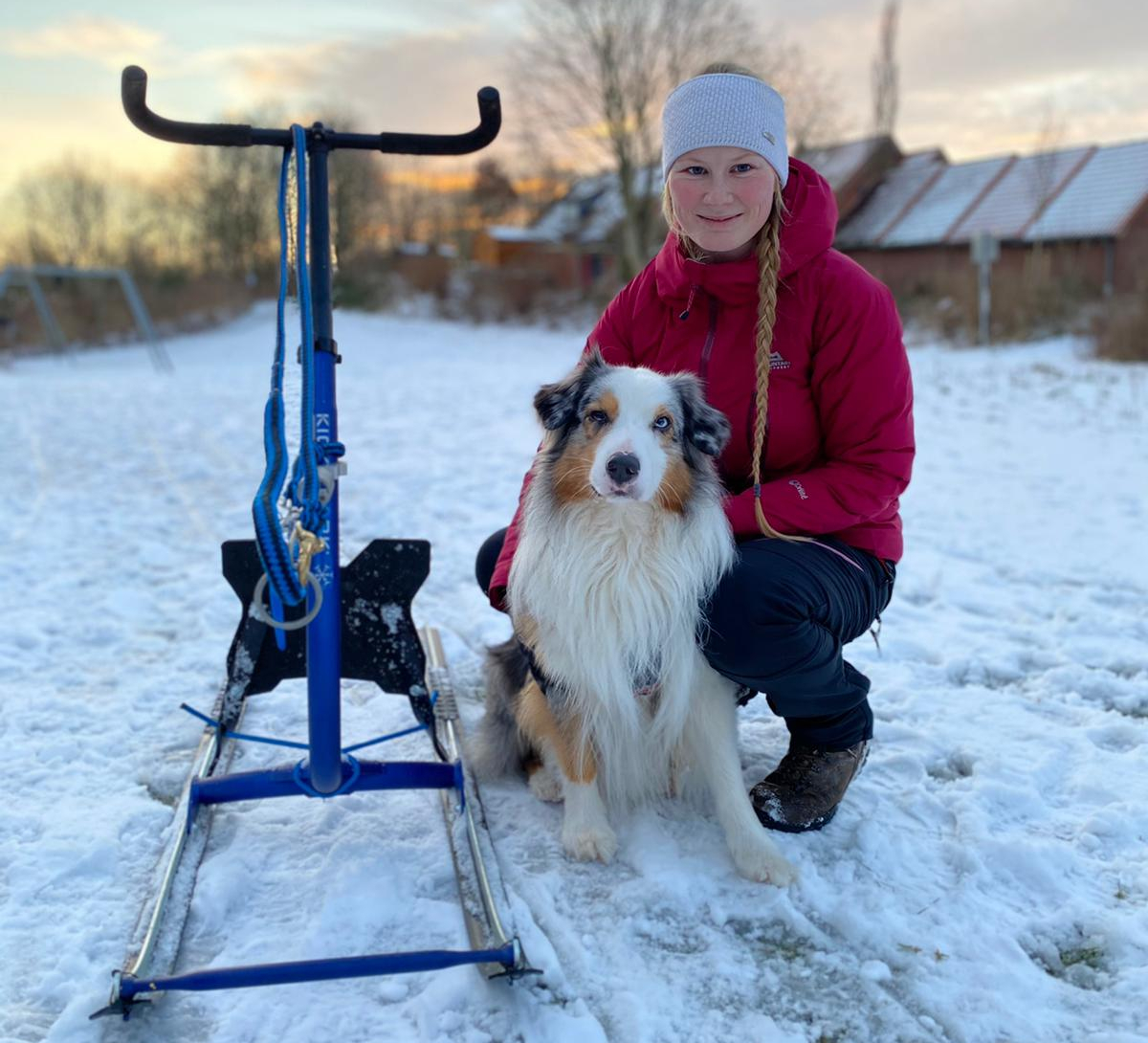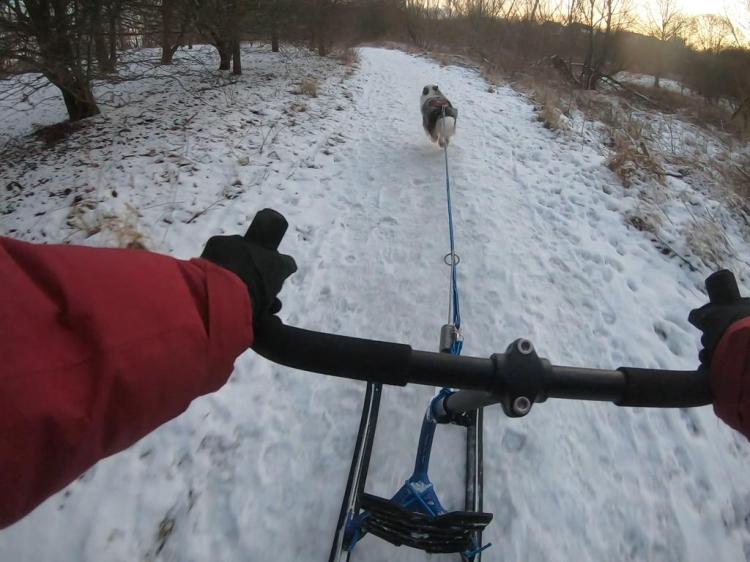 Den Gedanken hatte ich, weil ich mir nicht vorstellen konnte, wie schwer oder leicht es für Buddy sein wird. Völlig unnötige Gedanken. Dass der Raketenaussie mich da so durch den Schnee fetzen lässt, hätte ich im Leben nicht gedacht. Buddy wiegt 23kg und ich 63kg. Je weniger Gewicht der Hund hat, desto weniger Kraft hat er in der Regel. Bei Schlittenhunden, die dafür gezüchtet sind, wie etwa Diego, der schwarze Blitz mit um die 24kg, also nicht viel schwerer als Buddy, zieht natürlich kräftiger. Buddy kann den Kickspark und mich auch keinen ganzen Kilometer am Stück ziehen. Deshalb gibt’s dann Intervalle, so wie ich denke, dass Buddy das gut leisten kann.