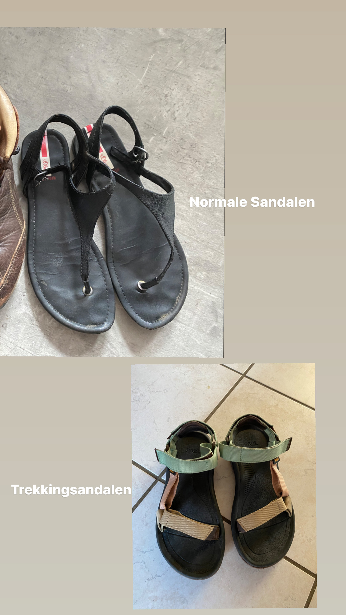 - Definitiv Sandalen, die zum Wandern geeignet sind und vorne offen sind. Keine Zehentrenner. Die habe ich in der Regel an, sobald wir unseren Zeltplatz gefunden haben bis ich in den Schlafsack hüpfe und morgens direkt wieder bis zum Aufbruch zur nächsten Etappe. Im Falle von Blasen kann ich dann die Sandalen beim Wandern (mit Socken) anziehen und mit ihnen durch die Flüsse furten (davon gab es wirklich einige Male). Die Mücken haben sich über meine Zehentrenner gefreut, denn das geht ja nur barfuß – es gab unfassbar viele Mückenstiche. Außerdem sind Socken auch dann von Vorteil, wenn es kalt ist.